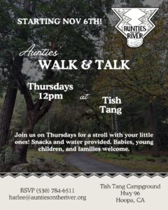 You are invited to join the weekly Aunties Walk & Talk on Thursdays at the Tish Tang Campgrounds at 12 PM
