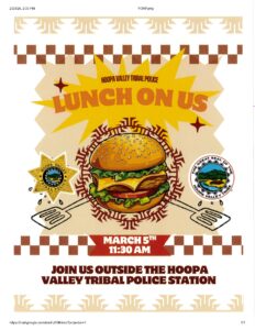 The Hoopa Tribal Police invites you to lunch today in front of the Police Station. Lunch starts at 11:30 am.